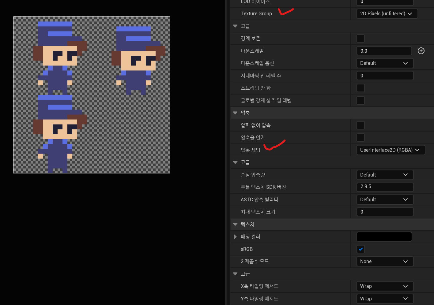 언리얼로 텍스쳐를 임포트 하고, 텍스쳐 디테일 창에서 아래 두 개 항목을 맞춰준다.