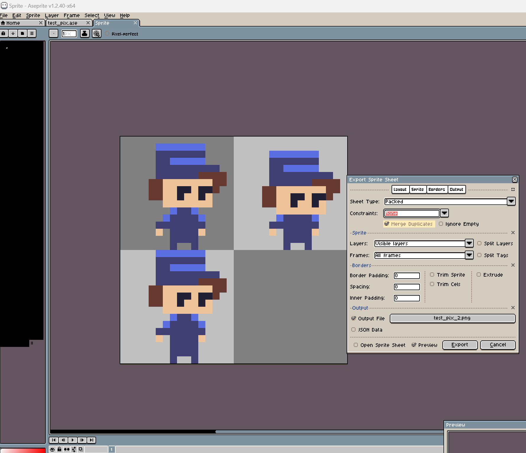 16x16 크기의 idle 애니메이션 4장 ( 1-2-1- 4 ) 를 만들어주고 익스포트 하면 아래와 같은 창이 뜬다.